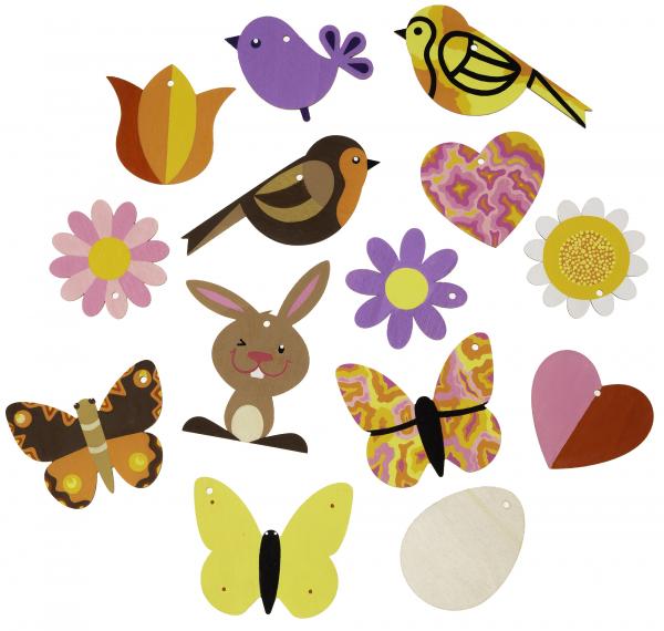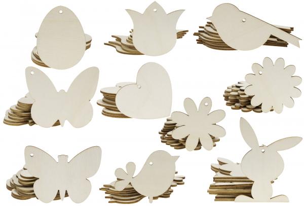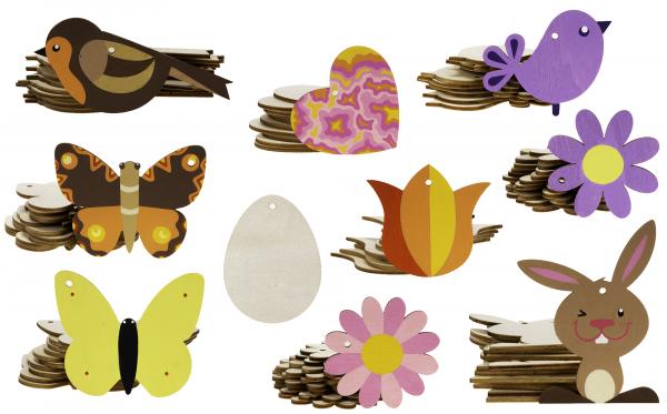 100 Holz-Anhänger mit 10 Frühlingsmotiven zum Gestalten und Bemalen