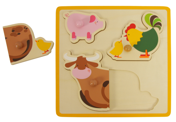 Wo passt das kleine Schweinchen rein? Hier oder da? Und der Hahn? ...und erst die Kuh – denn die besteht gleich aus zwei Teilen. Aber ganz gleich, wie lange du brauchst - mit dem runden Griff lassen sich die Figuren leicht in die dafu?r vorgesehenen Felder hineinlegen. Das schult das räumliche Sehvermögen und die Feinmotorik.