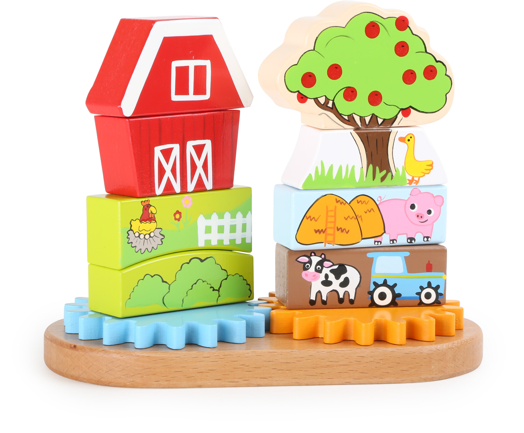 Bei diesem Steckspiel sollen die unterschiedlichen Bausteine auf die 2 Stäbe so angeordnet werden, dass am Ende dieser Bauernhof entsteht. Das erfordert räumliches Vorstellungsvermögen, um stets die richtigen Formen zu finden. Spielerisch erfahren Kinder so die Eigenschaften unterschiedlicher geometrischer Figuren. Wer an den beiden Zahnrädern dreht, kann Tiere und Scheune um die eigene Achse drehen lassen. So wird auch die Feinmotorik spielerisch gefördert.