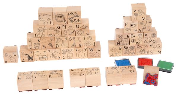 Zum Lernen des ABC. Die Holz- Anlautstempel zeigen Großbuchstaben, Kleinbuchstaben und zugehörige Anlaut-Bilder. So lernen Kinder, sich erste Wörter selbst zu erschließen. Es können aber auch andere Wörter mit dem gleichen Anfangsbuchstaben gesucht werden. Stück für Stück tauchen Kinder so in die Welt der Bchstaben ein.