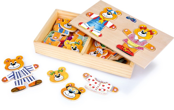 Hier können zwei Bären komplett eingekleidet werden. Zum Kopf können jeweils ein Mittelteil und ein Fußteil zugeordnet werden. Hier gilt es, das passende Gegenstück zu finden. Zuordnen und Sortieren gehört zu gern erledigten Aufgaben von Kindern im Vorschulbereich. Das sind mathematische Grunderfahrungen, welche das spätere Rechnen fördern.