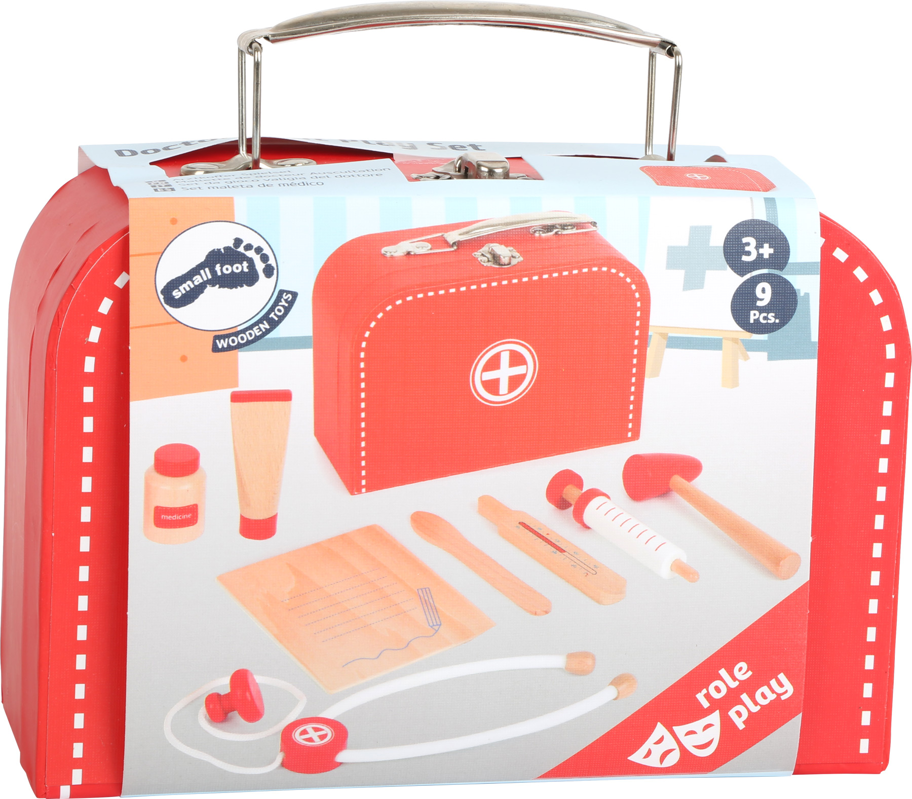 Hiermit können die Puppen und Teddys schnell versorgt werden. Alle wichtigen Instrumente sind dafür vorhanden: ein Stetoskop, ein Fieberthermometer, eine Spritze mit Pumpmechanismus, ein Notizbrett, eine Salbe und Creme uvm.. Da wird die Behandlung garantiert gelingen. Zum Schluss wird alles in den praktischen Arztkoffer aufgeräumt. 9-teilig.
