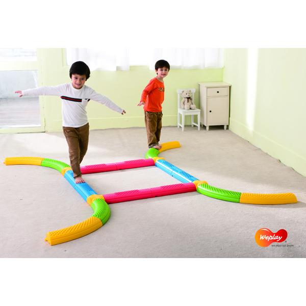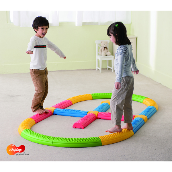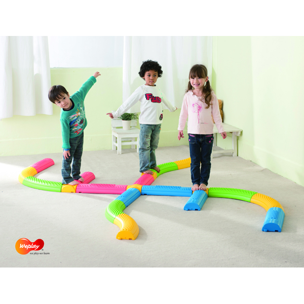 ... Noppen auf der Oberseite stimulieren die Fußsohlen, die Elemente fördern Balance und Koordination. Jedes Element ist mit Antirutschfüßen versehen. Inhalt: 8 Kurven, 8 Geraden, 4 Verbinder. Belastbar bis 80 kg.