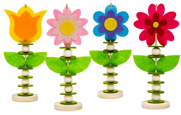 Das 54-tlg. Set besteht aus Filzscheiben und Holzkugeln, die einfach auf einen Stab aufgereiht und auf den Standfuß gesteckt werden.