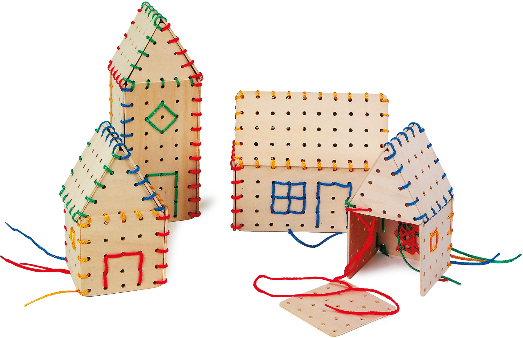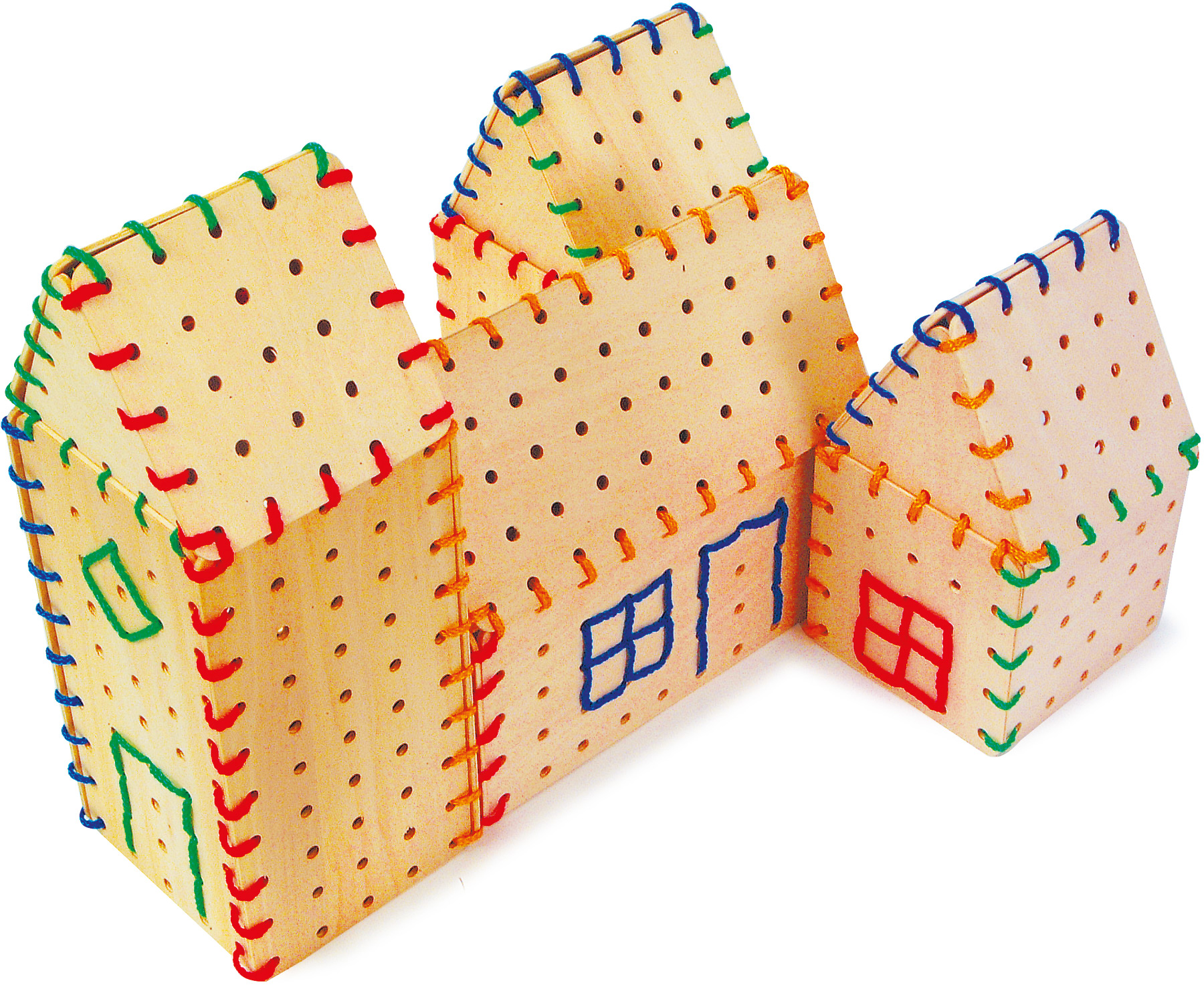 32 Teile aus Schichtholz können miteinander kombiniert und zu kleinen Häusern "zusammengenäht" werden. Viele bunte Fäden sorgen für einen sicheren Stand. Kreative Kinder können den Häusern auch Türen und Fenster verleihen. Dabei wird das räumliche Denken und das motorische Feingefühl entwickelt.