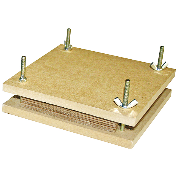Sammelstücke der Exkursion wie z. B. Insekten, Blätter, Blumen, werden mit dieser Presse konserviert. Die Pflanzen werden in das beiliegende Saugpapier und zwischen die 8 Pappschichten gelegt. Die festgezogenen Flügelschrauben üben Druck auf die zwei quadratischen Holzplatten aus und pressen 8 Etagen auf einmal.
