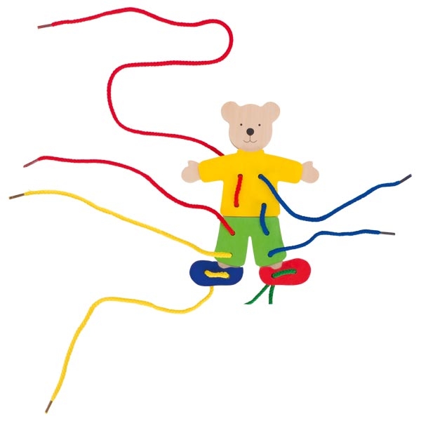 Die Kleidung ist dem Bären etwas zu groß, deshalb muss sie mit den Schüren befestigt werden. Dies schult nicht nur die Geduld und Hand-Auge-Koordination, sondern auch die Feinmotorik.