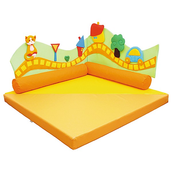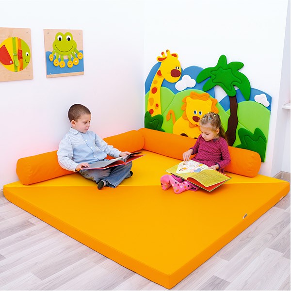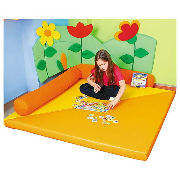 Die beiden fest miteinander verbundenen Dreieckmatten bilden übereinander gelegt eine Eckmatte, aufgeklappt entsteht eine große, quadratische Fläche für Spiel, Spaß und Übungszwecke. Sie passen sowohl zu unseren Spielecken (Bsp. 100931) als auch zu den weichen Elementen der Wanddekorationen (Bsp. I196003, I196061), die gleichzeitig als Wandschutz dienen, oder in einen Ruhebereich. Die Schaumstoffrollen (I101081, I101658, I101659 – separat bestellbar) sind als Lehne ideal.