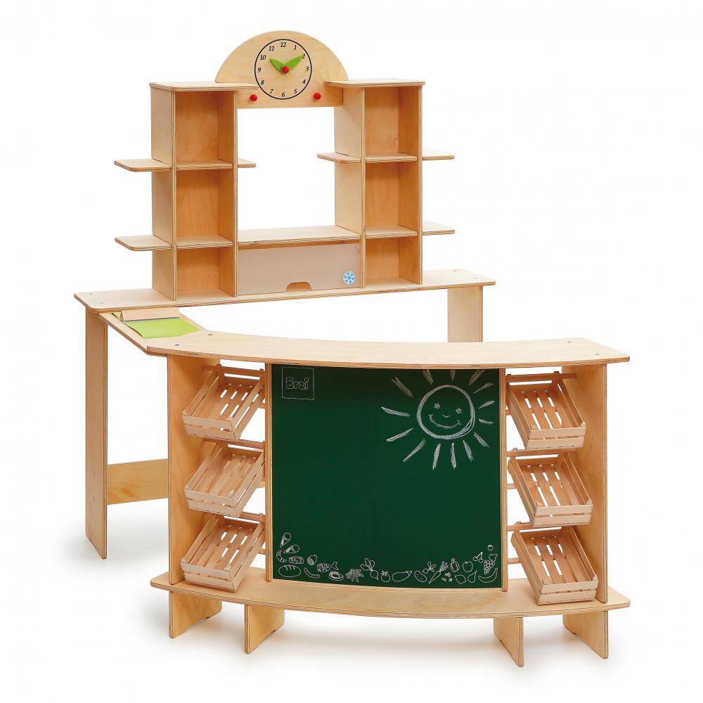 - Inhalt: 1 Kaufladenregal,1 Verkaufstresen, 1 Verbindungsplatte mit Fließband und Warentrenner, 6 Obststiegen, 1 Montageset, Aufkleber