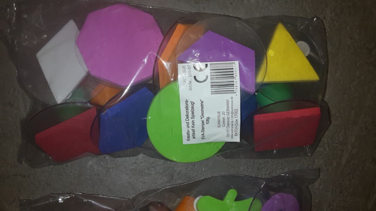 So macht Geometrie Spaß! Mit diesen Riesenstempeln können im Handumdrehen Kreis, Rechteck, Dreieck entstehen. Ob daraus auch ein großes Bild entstehen kann? Versucht es einmal! Mit unseren verschiedenfarbigen Stempelkissen kann das Bild ganz bunt werden.