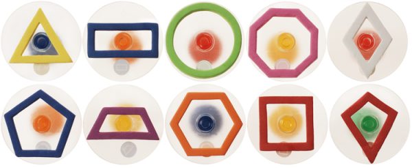So macht Geometrie Spaß! Mit diesen Riesenstempeln können im Handumdrehen Kreis, Rechteck, Dreieck entstehen. Ob daraus auch ein großes Bild entstehen kann? Versucht es einmal! Und hinterher könnt ihr alles bunt ausmalen.