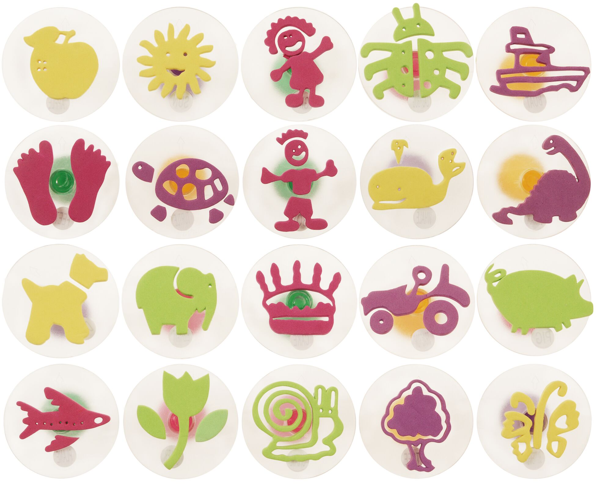 bietet dir das EVA-Stempelset "Bilder". Gestalte damit buntes Geschenkpapier oder auch bunte T-Shirts mit deinen Freunden auf deiner nächsten Geburtstagsparty. Aber Achtung: Verwende dann Textilfarbe