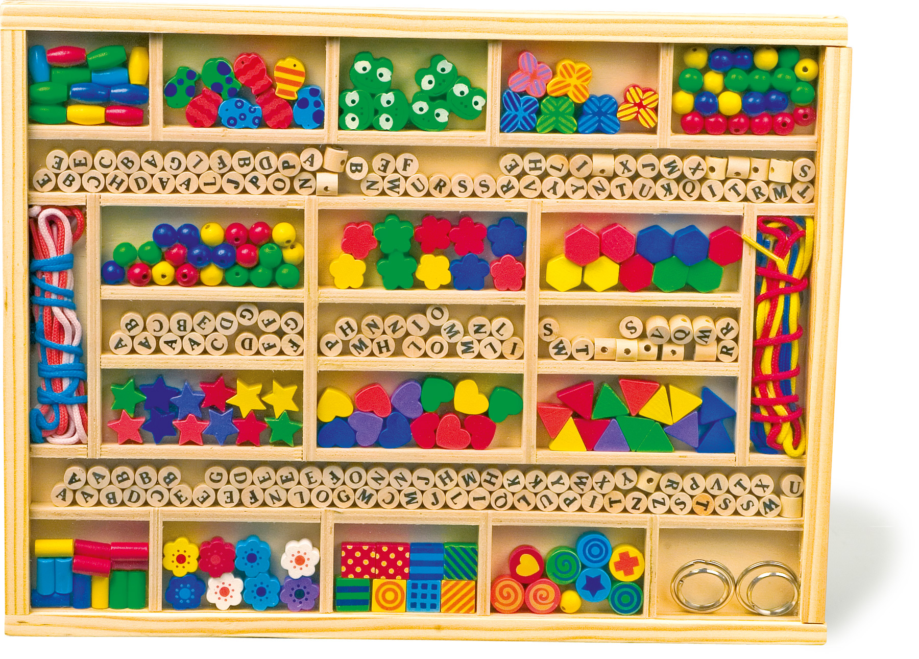 Dieser Holzkasten mit reichhaltigem Zubehör (bedruckte Buchstaben, Blumen, Perlen, Sterne usw.) und viele bunte Bänder stehen zum Fädeln zur Verfügung. Mit den Sortierfächern ist nicht nur alles gut aufgeräumt, sondern sie fördern durch das Zuordnen auch die mathematische Bildung.