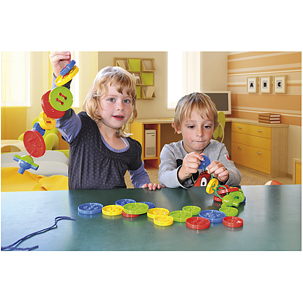 Zum Fädeln, Sortieren und Spielen: Rot, Gelb, Grün, Blau sind alle Knöpfe mit 1 bis 5 Löchern. Beim Fädelanfang sorgen Stopper dafür, dass die Knöpfe nicht von den Schnüren rutschen. Fördert Feinmotorik, Konzentration und Auge-Hand-Koordination.