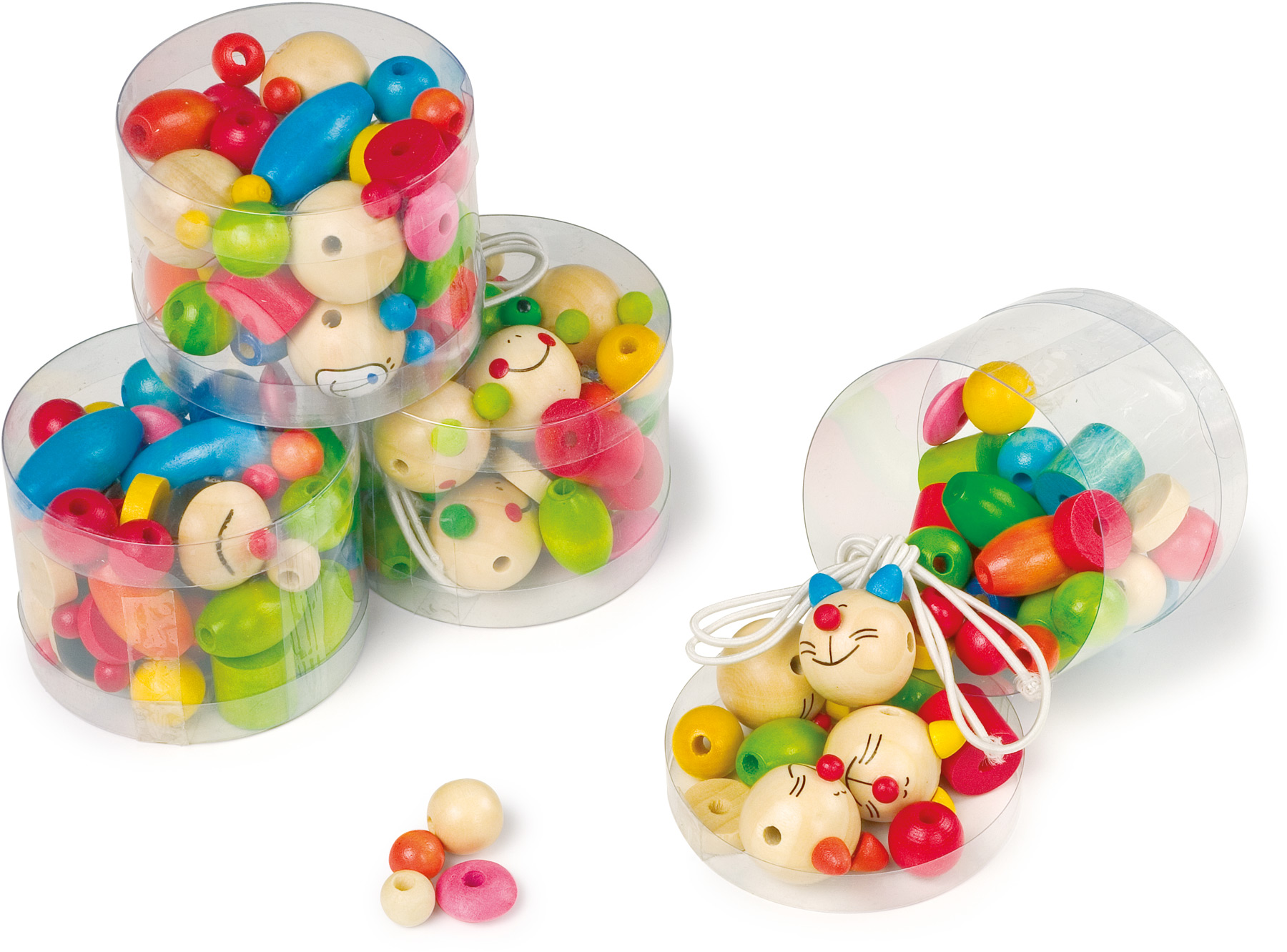 Im 4er - Set werden verschiedene Fädelformen aus Holz (Köpfe, Perlen und geometrische Figuren) in unterschiedlichen Farben geliefert. Daraus lassen sich wunderschöne Ketten oder Anhänger fädeln. Auch zum Verschenken geeignet.