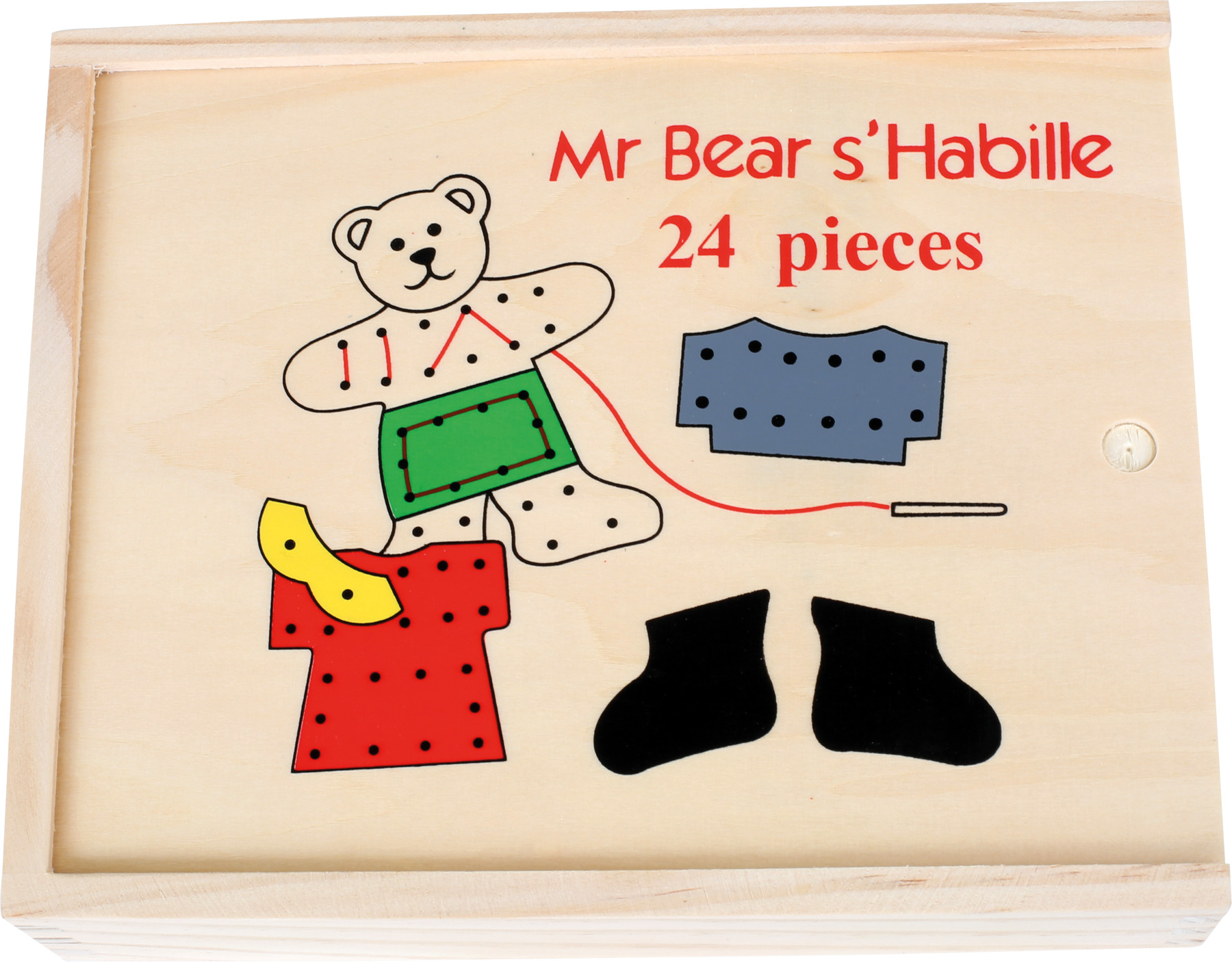 Hier bekommen Teddys ein Outfit! Hosen, Pullover, Kleider und Schuhe in unterschiedlichen Farben, welche alle miteinander kombiniert werden können. Fädelschnüre mit Holzstift helfen beim Anbringen. Viel Ausdauer und Konzentrationsvermögen wird dabei gefördert, vor allem aber auch die Feinmotorik der Kinder.