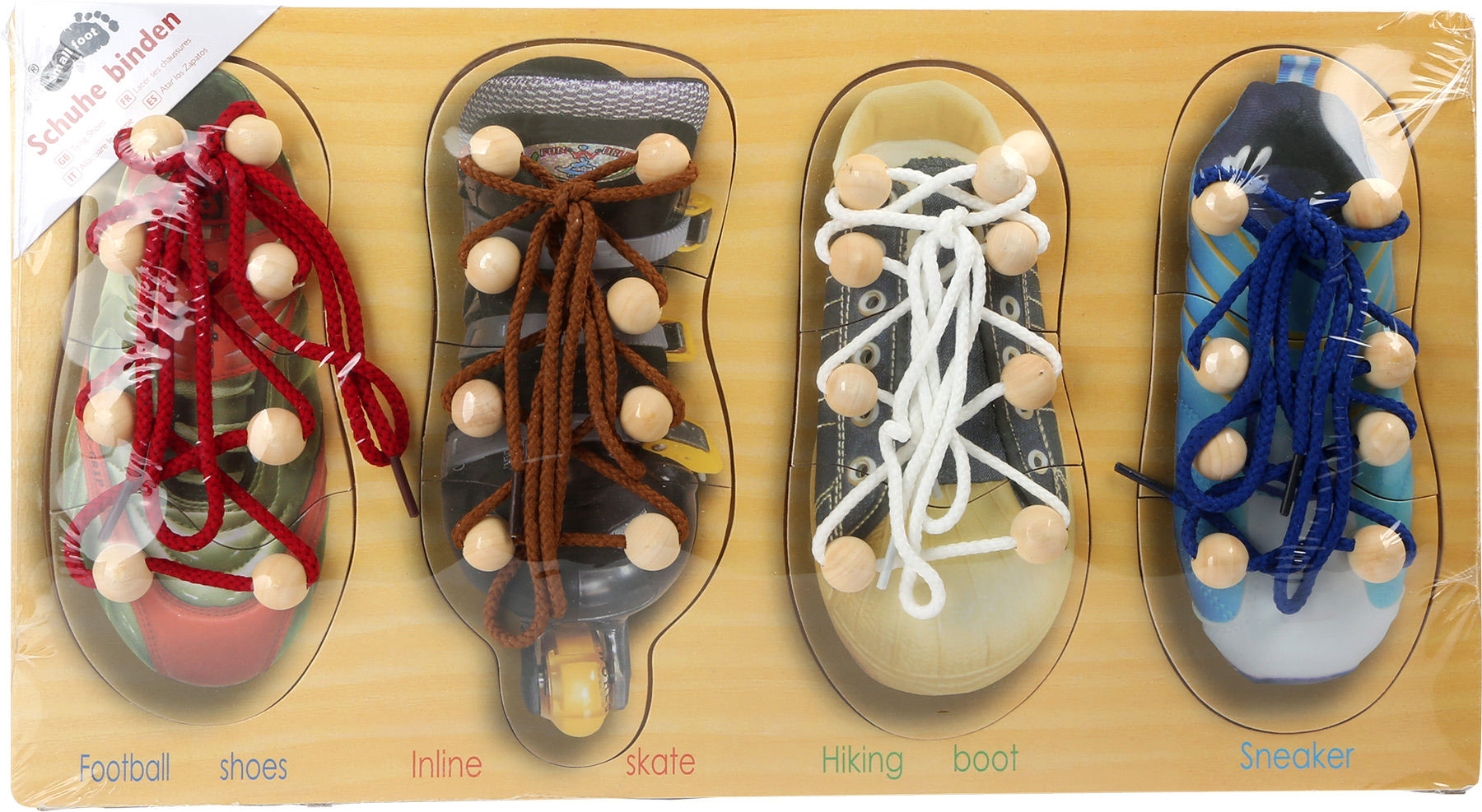 Vier verschiedene Schuhe bieten hier die Möglichkeit zum Ausprobieren und Üben. Die Schnürsenkel können dabei durch Holzperlen gefädelt werden. Das fördert zusätzlich die Entwicklung der Feinmotorik.