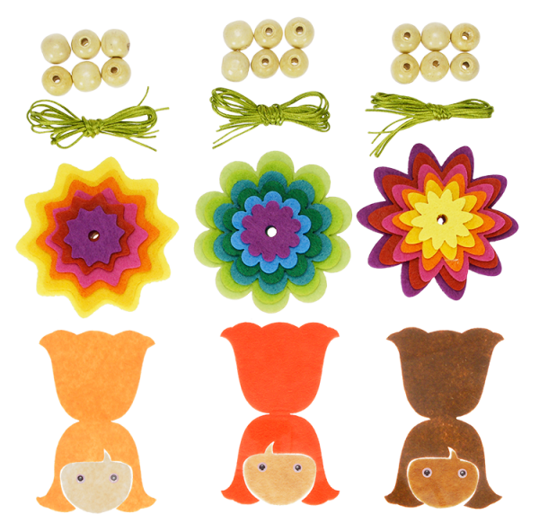 - Inhalt: 3 x 6 Blüten aus Polyesterfilz, 18x Holzperlen, 3x Fädelschnur, 6 Augen, 3 Filz-Gesichter, 3 Filz-Frisuren