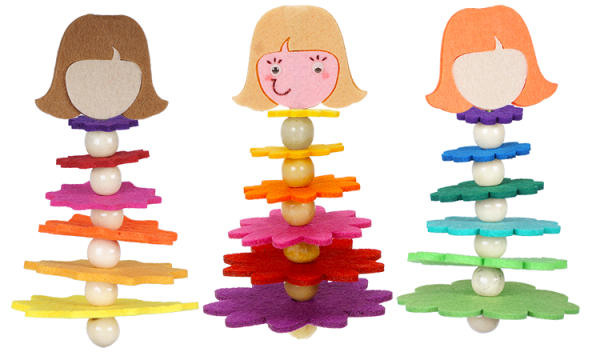 Bastelset für 3 süße Blumenmädchen. Die Filzblüten in abgestimmten Farben werden mit den Holzperlen aufgefädelt. Die Köpfchen bestehen aus verschiedenen Filzteilen, die aufeinander geklebt werden und so auch die Fädelschnur halten. Verschiedene Haut- und Haarfarben machen dieses 3er Set zu einem besonders schönen Frühlingsboten.