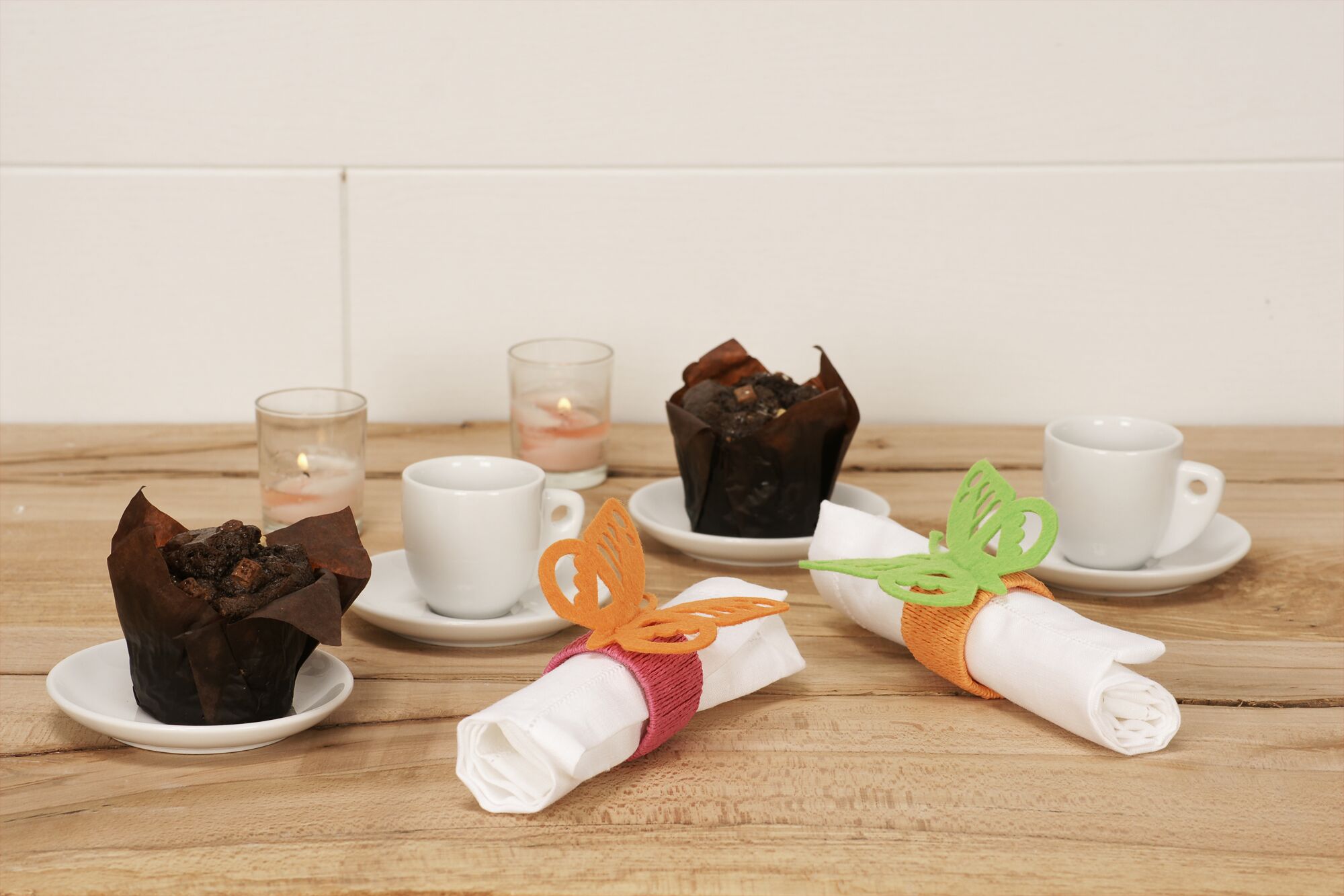 Mit diesen bunten Schmetterlingen kannst du beispielsweise Serviettenringe oder Papiertüten gestalten. Die Anhänger sehen aber auch an Zweigen befestigt toll aus.