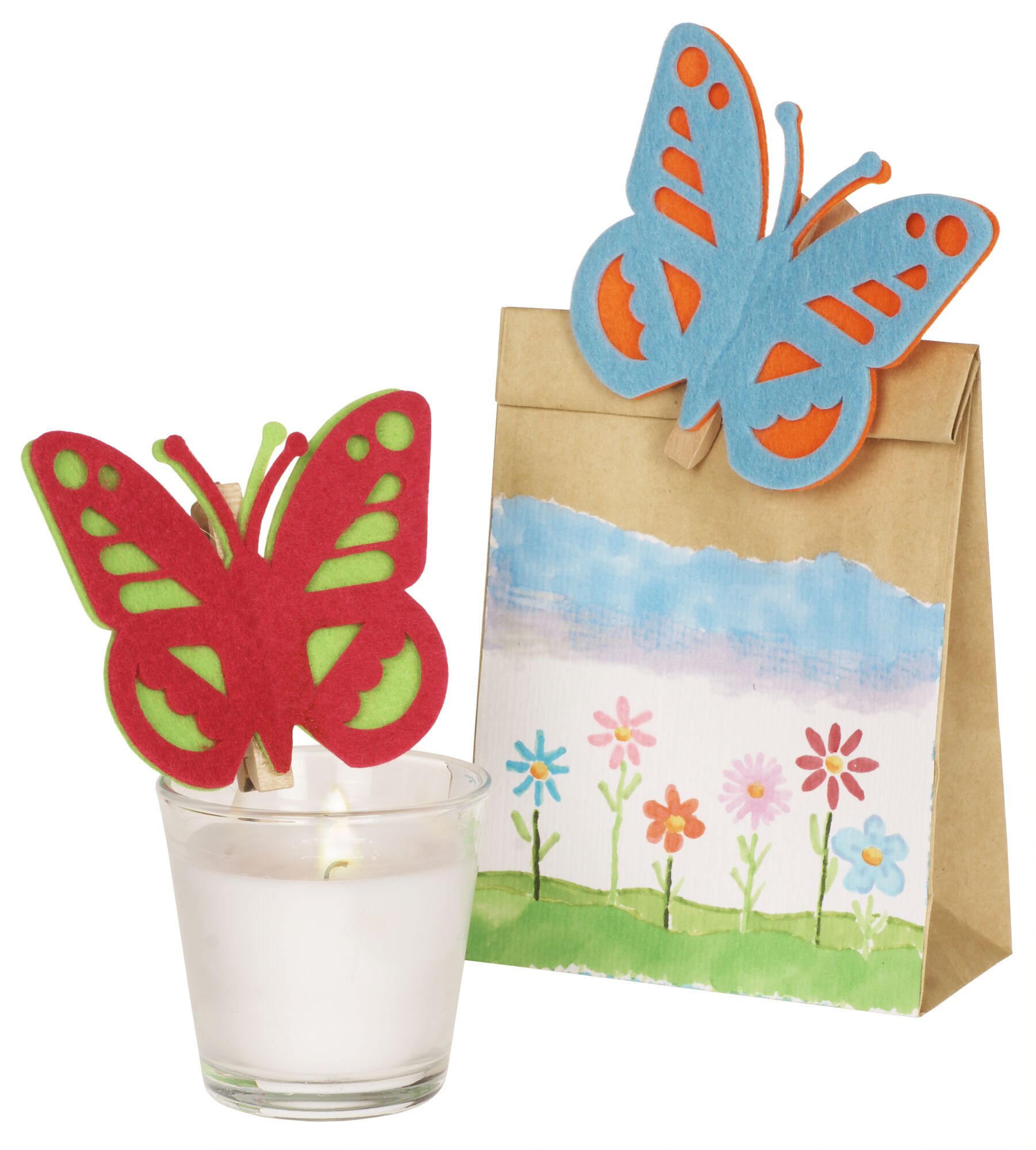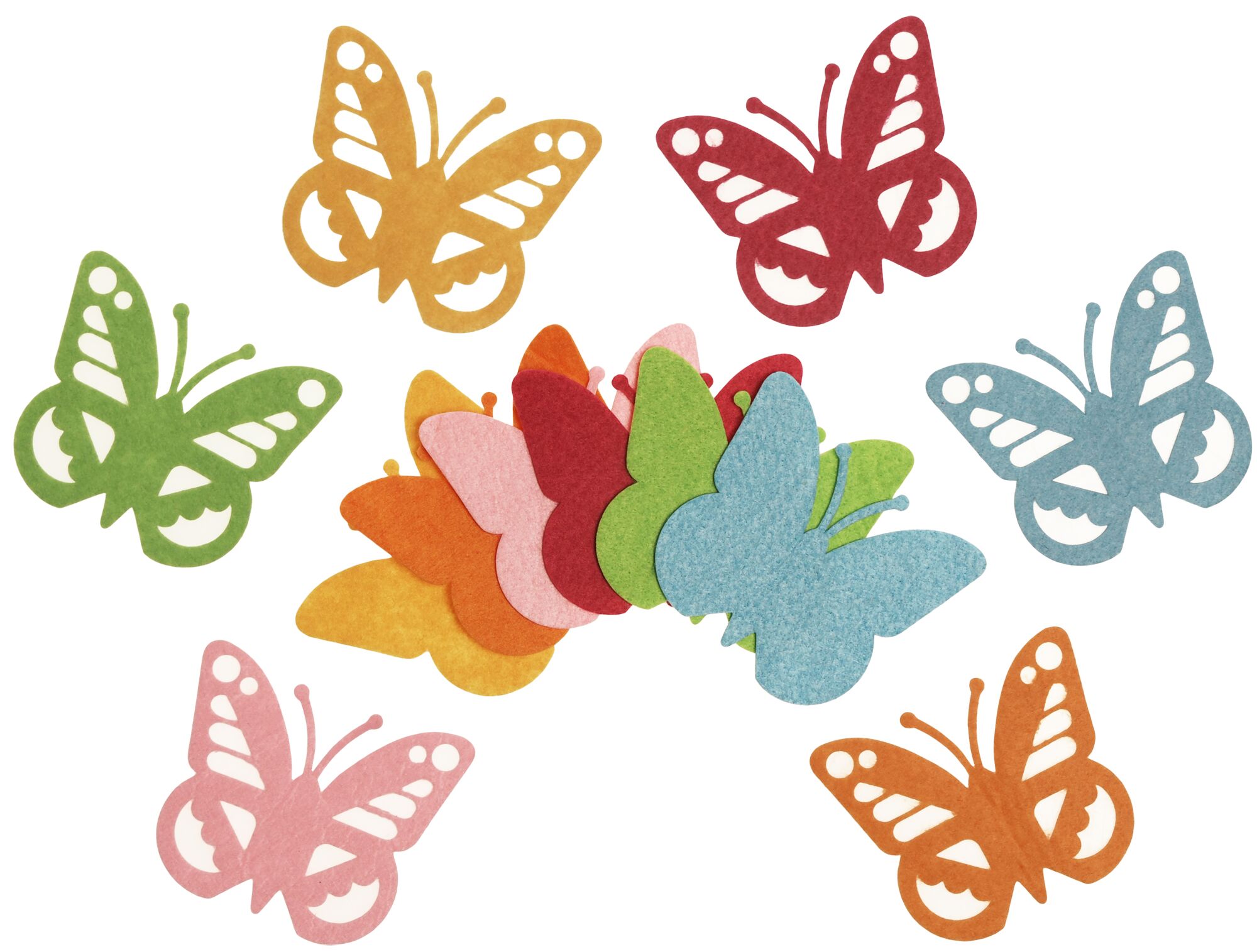 - Inhalt: 24 Filzanhänger „Schmetterling“ (12 mit Cut-Out, 12 vollflächige Schmetterlinge)