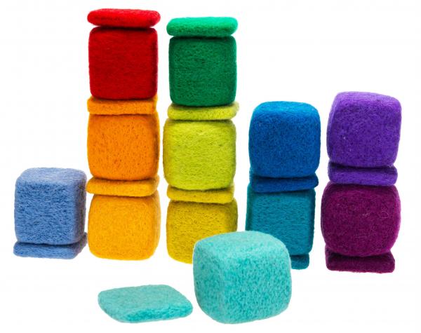 zum Stapeln, Sortieren und Spielen geeignet. Die Filz-Bausteine kommen in aufeinander abgestimmten Regenbogenfarben und sind besonders in der Bauecke beliebt. Die Vorteiele: verletzungsfreies und leises Spielen.