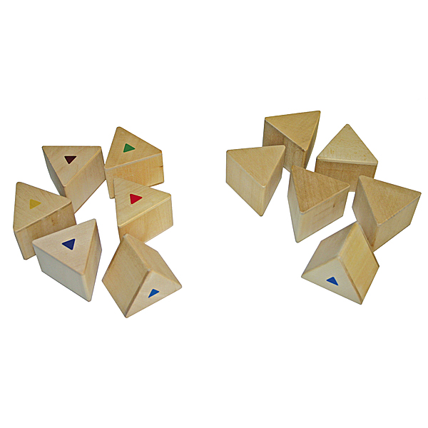 Diese 2 x 6 Prismas haben unterschiedliche Gewichte. Ziel des Zuordnungsspiels ist es, durch Abwägen jeweils das Paar mit dem gleichen Gewicht zu finden. Der farbige Kontrollpunkt an der Unterseite markiert gleiche Prismen. Das Spiel fördert die Sinnes- und Wahrnehmungsempfindungen und regt das Gedächtnis an.