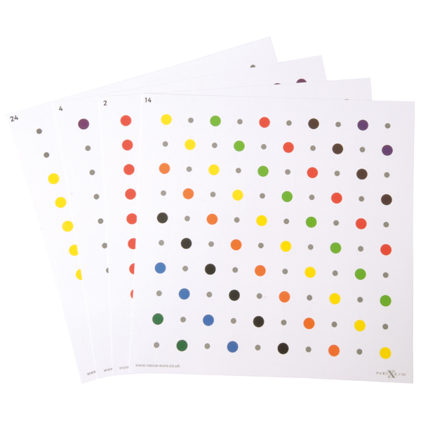 Inhalt: 1 Board, 24 Vorlagenkarten, 100 Stifte (10 x 10 Farben), Anleitung.