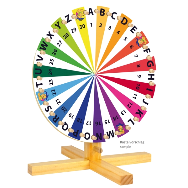 ... denn Sie können die 5 Blanko-Kartons für das Glücksrad selbst Gestalten: mit Zahlen, Buchstaben, Spielideen, Tieren, Märchenfiguren, Sport-Übungen, Wer-ist-dran-Aufgaben ... So ist das Glücksrad immer interessant: Beim Addieren- oder Buchstabieren-Üben, als Ideengeber beim Improvisationstheater oder als Glücksrad beim Sommerfest. Einfach das entsprechende Motiv mit der Holzschraube auf der Platte befestigen ? schon ist das Rad fertig zum Dreh. Mal sehen, an welchem Holzstift der Stopper stehen bleibt.
