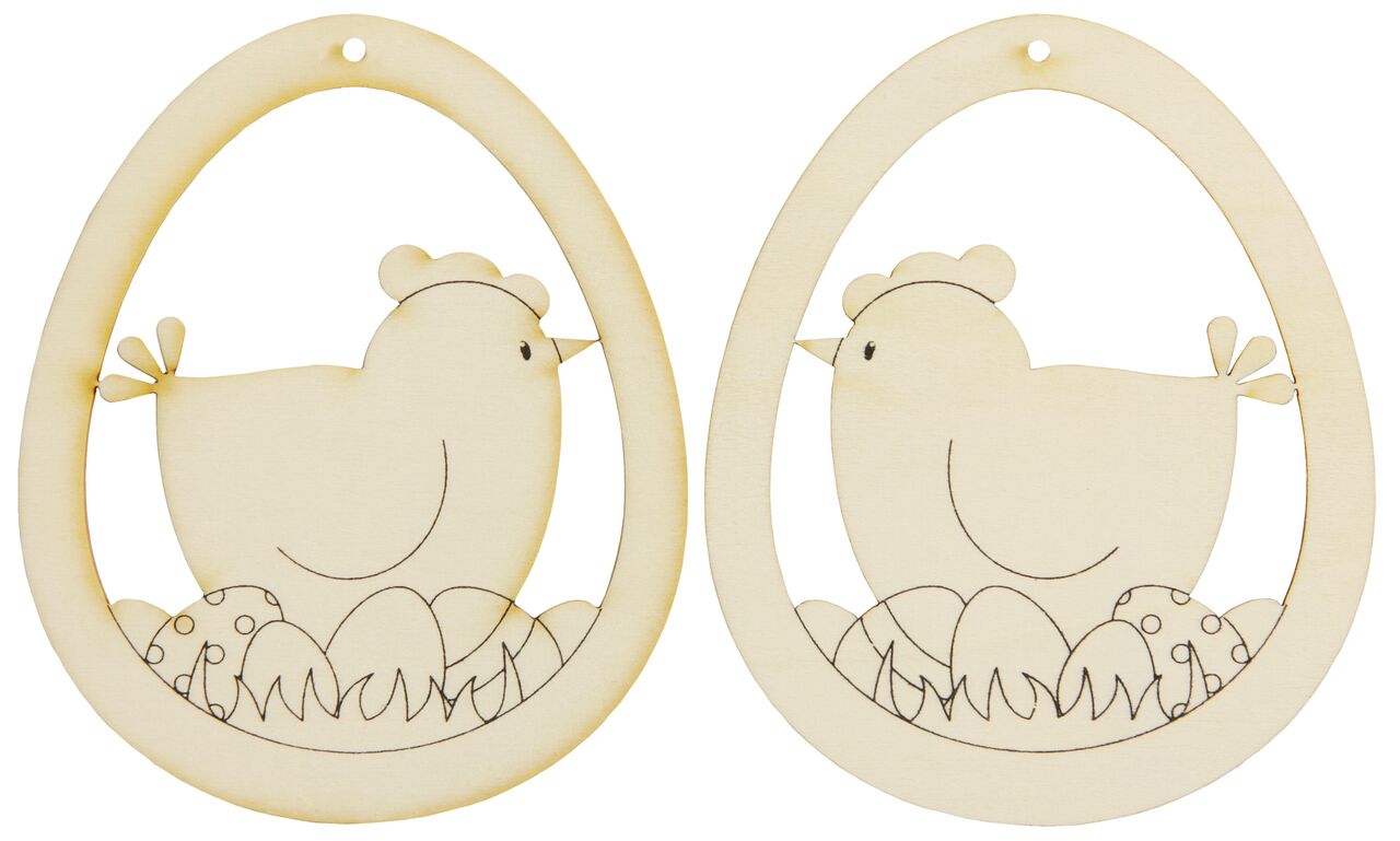 - Lieferumfang: 4 Holzanhänger "Huhn Elfriede", unbemalt
