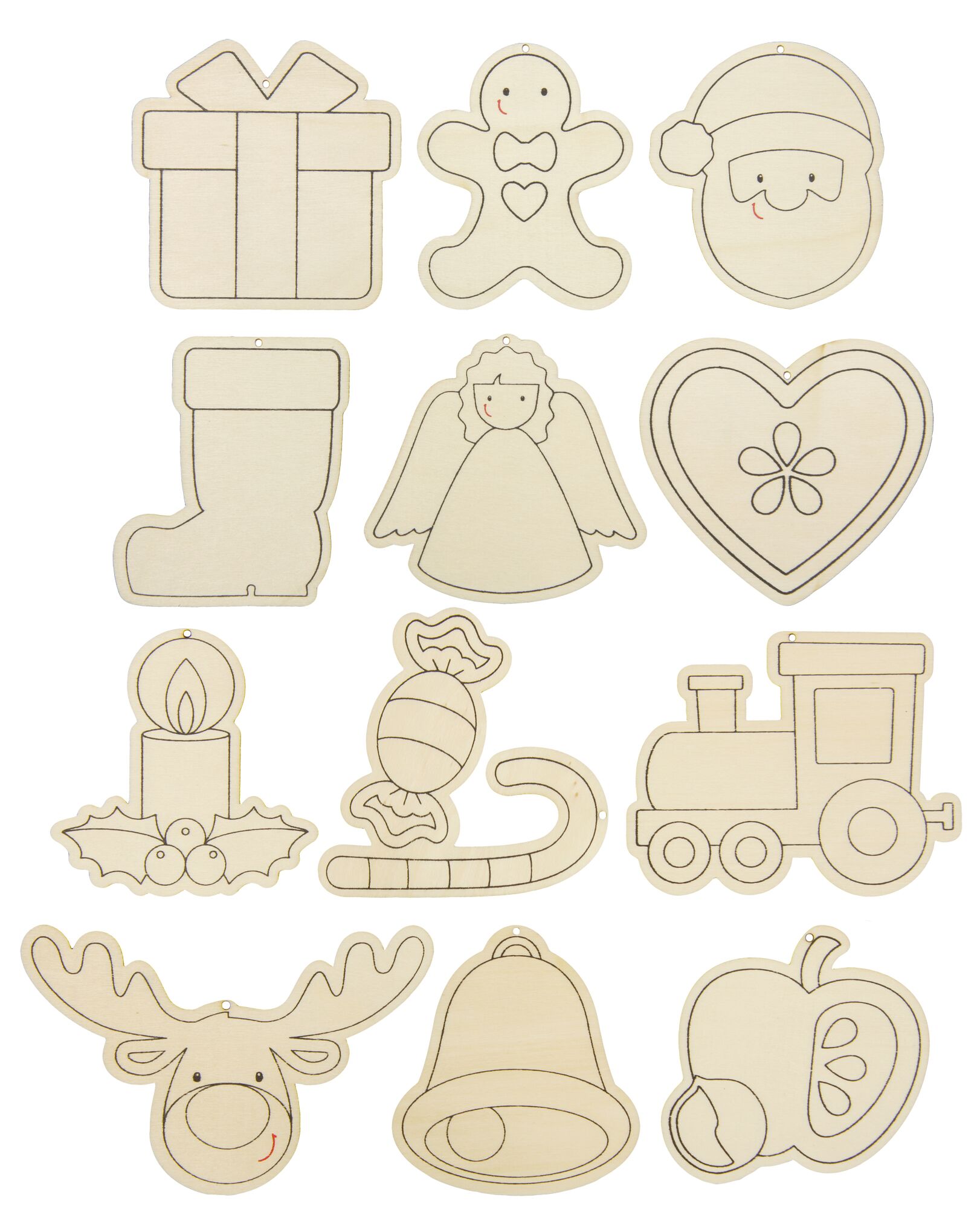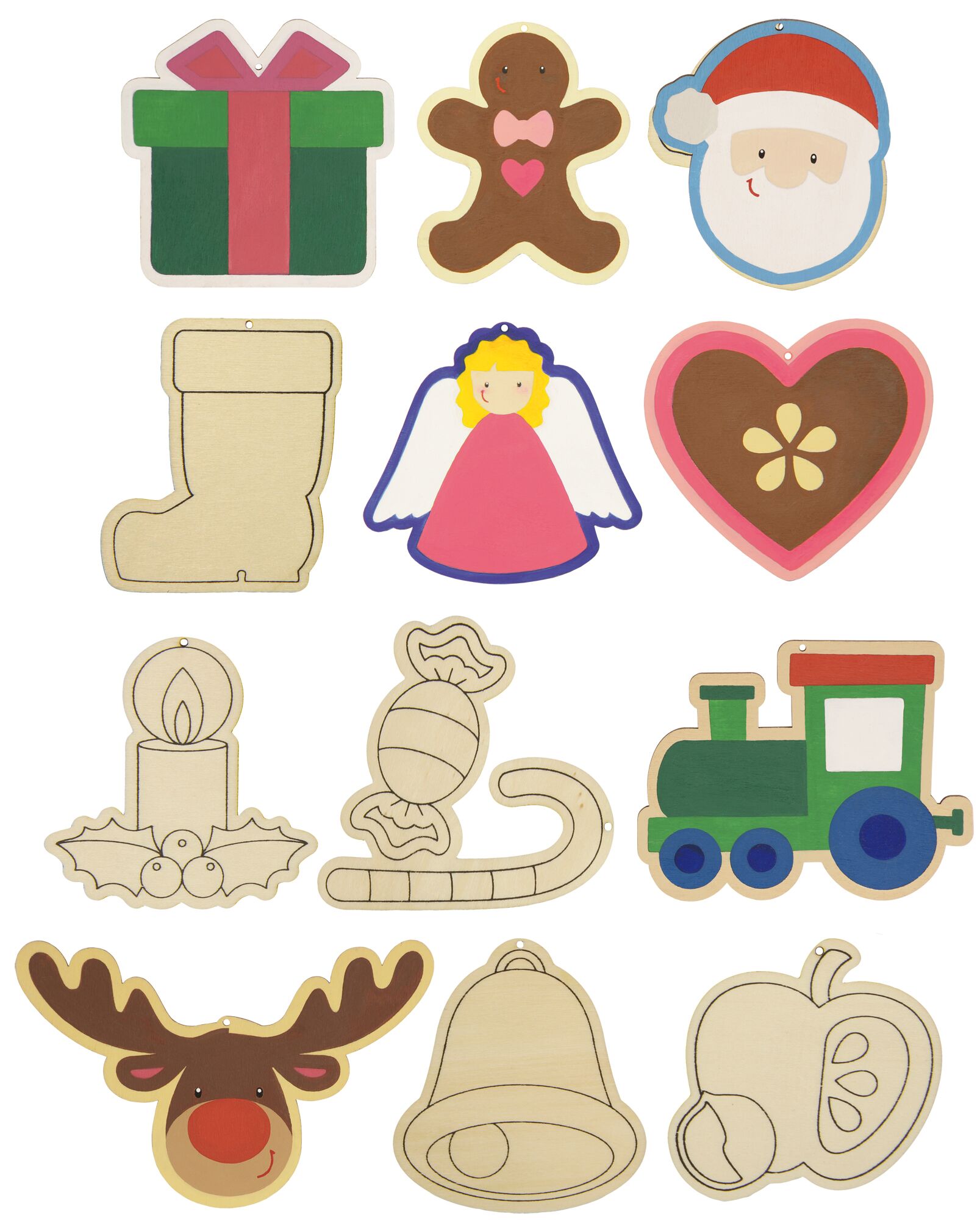 12 bekannte Weihnachtsmotive auf Sperrholz bedruckt wollen hier dekorativ gestaltet werden. So entstehen besondere individuelle Weihnachtsgeschenke für die Lieben, welche später Strauch und Baum schmücken. Ob bemalt oder mit Materialien wie Glitzersteinen beklebt, in jedem Fall werden sie die Fantasie der Kinder anregen und deren Feinmotorik schulen.