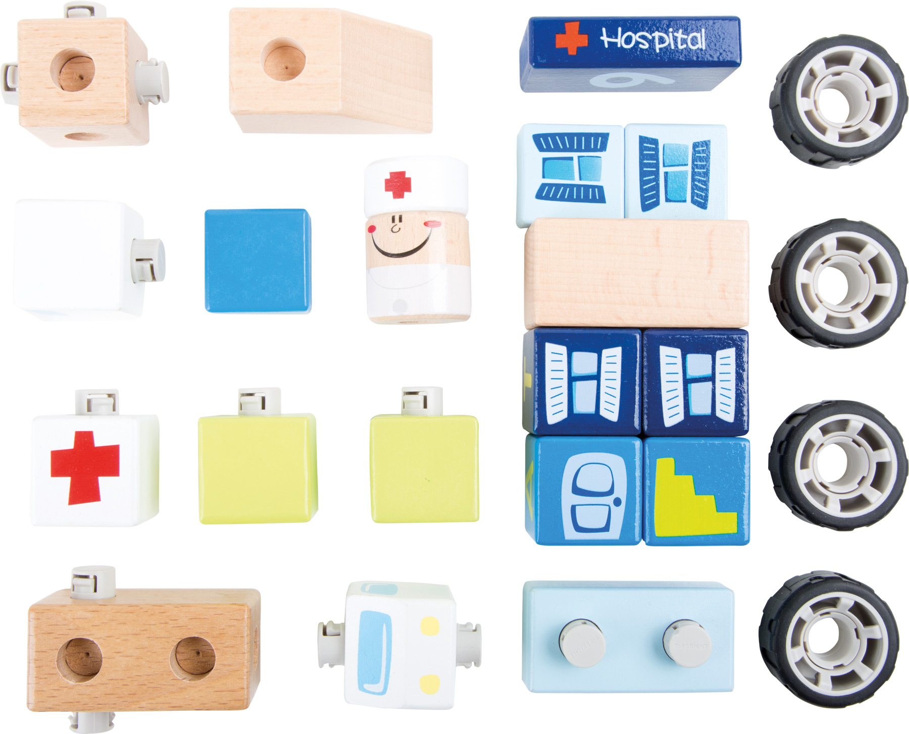 Diese einzelnen Holzbausteine lassen sich zu einem Rettungswagen und einem Krankenhaus zusammenstecken. Da sind erst einmal Spannung und Puzzeln angesagt, bevor es ans Spielen geht. Räumliches Vorstellungsvermögen und Kreativität sind dabei genauso gefordert, wie motorische Fähigkeiten. Na dann vorwärts mit Tatütata!