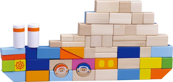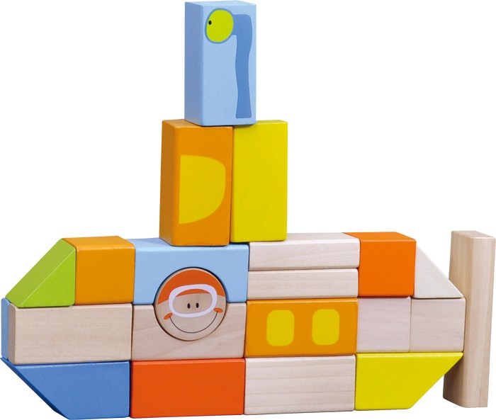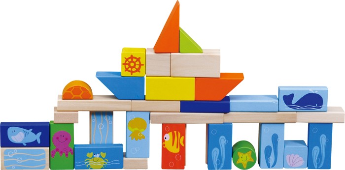 Mit diesem Bausteinset lassen sich hervorragend Schiffe und Unterwasserboote bauen. Mit etwas Fantasie entstehen damit auch herrliche Unterwasserstädte. Die teilweise bemalten Holzbausteine unterstützen dieses Vorhaben. So werden Kreativität, Konzentration und Feinmotorik spielerisch herausgefordert. Auch das anschließende Aufräumen gelingt spielerisch, denn durch die unterschiedlichen Öffnungen im Deckel können die dazugehörigen Steine gesteckt werden. Das benötigt räumliches Vorstellungsvermögen, aber bereitet viel Freude.