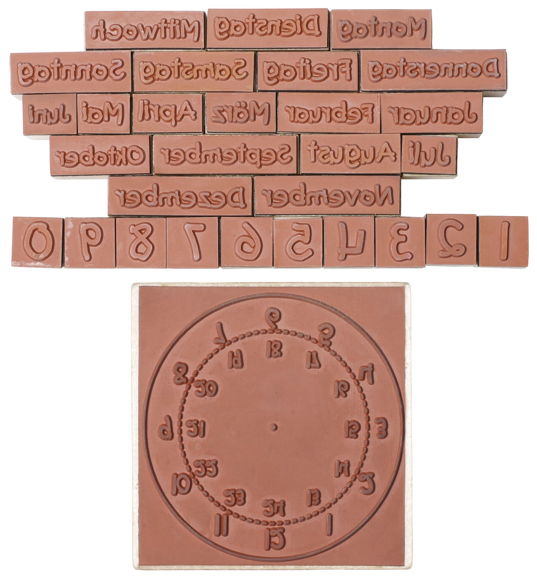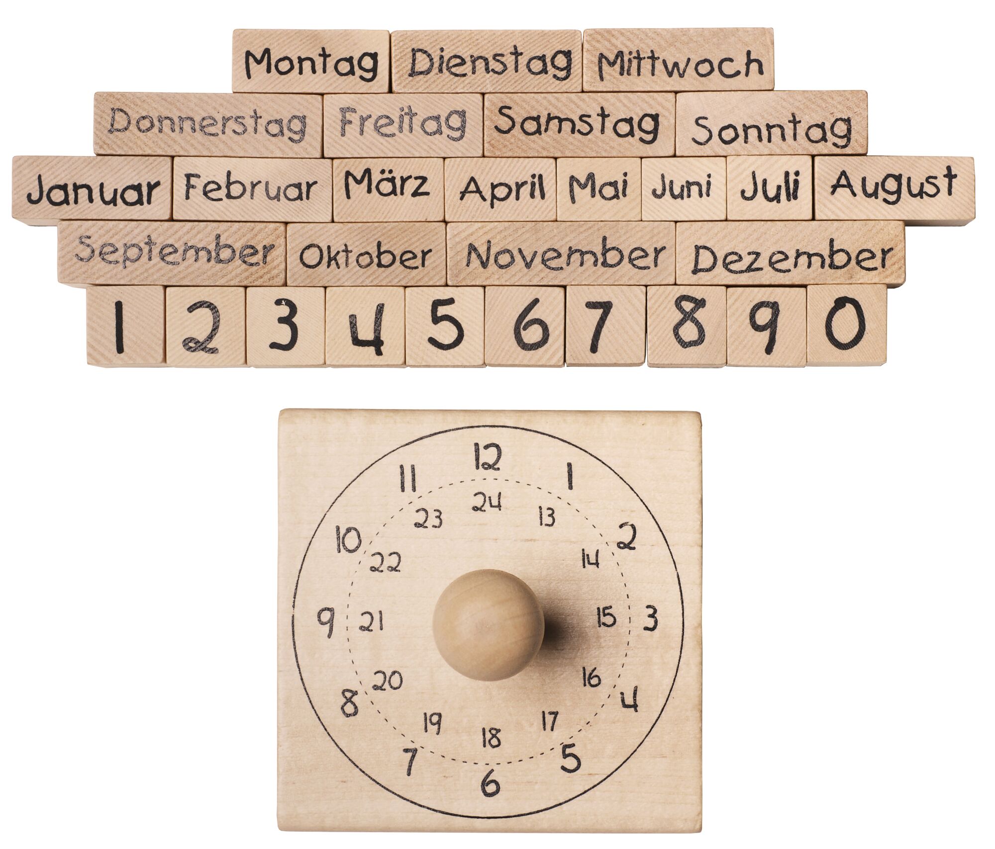 - Inhalt: 30 Holzstempel (Uhr, Monate, Wochentage, Zahlenstempel 0 bis 9)