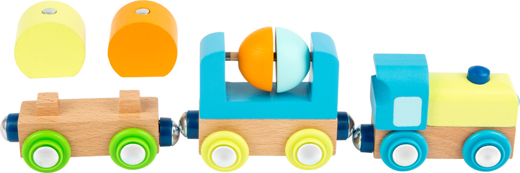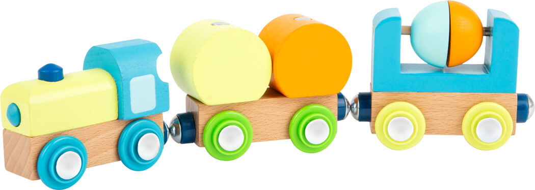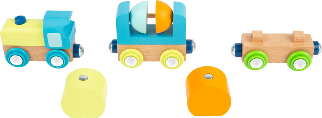 Kleine Lokführer aufgepasst! Diese Eisenbahn gibt es gleich mit zwei Anhängern, welche auch beladen werden können. Magnete erleichtern das Verladen der Fracht und sind deshalb auch für Kleinkinder sehr gut geeignet. Los geht die Fahrt! Die Eisenbahn passt auf alle gängigen Holzeisenbahn-Schienen.