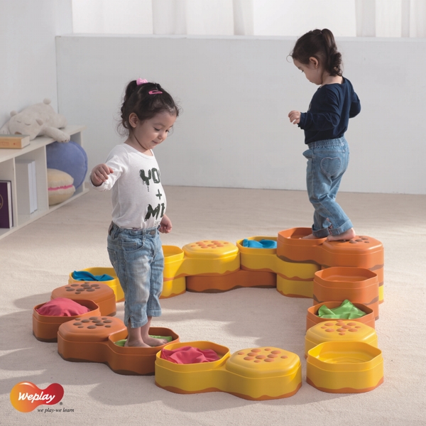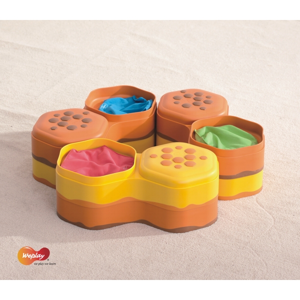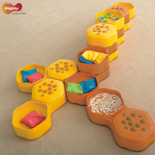 ... mit den Weplay Honey Hills. Erlebe ein umfangreiches Wahrnehmungstraining mit Höhen und Tiefen und fülle die Honey Hills nach deinen Wünschen und Vorstellungen zum Beispiel mit Gras, Sand, Wasser oder fülle die bunten Säckchen mit allerlei verschiedenen Materialien. Unendlich erweiterbar... oder auch in Kombination mit den Regenbogenflusssteinen EDKT0008, Regenbogenwegen EDKT0009-00B und -00G sowie den Balance Clouds EDKT0012 variabel einsetzbar. Inhalt 6x Steine (3x gelb, 3 orange), 3x Säckchen zur Befüllung (1x rot, 1blau, 1x grün). Tiefe der Honey Hills 5,5 cm.