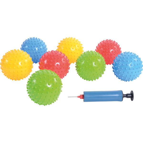 Die griffige Oberfläche der Igelbälle eignet sich hervorragend für Greifübungen und sanfte Massagen ? sie stimuliert die Sinnes-Rezeptoren und fördert dabei die bewusste Wahrnehmung. Set: 25 luftleere Igelbälle in gelb, rot, grün, blau und 1 Luftpumpe mit Nadelventil.