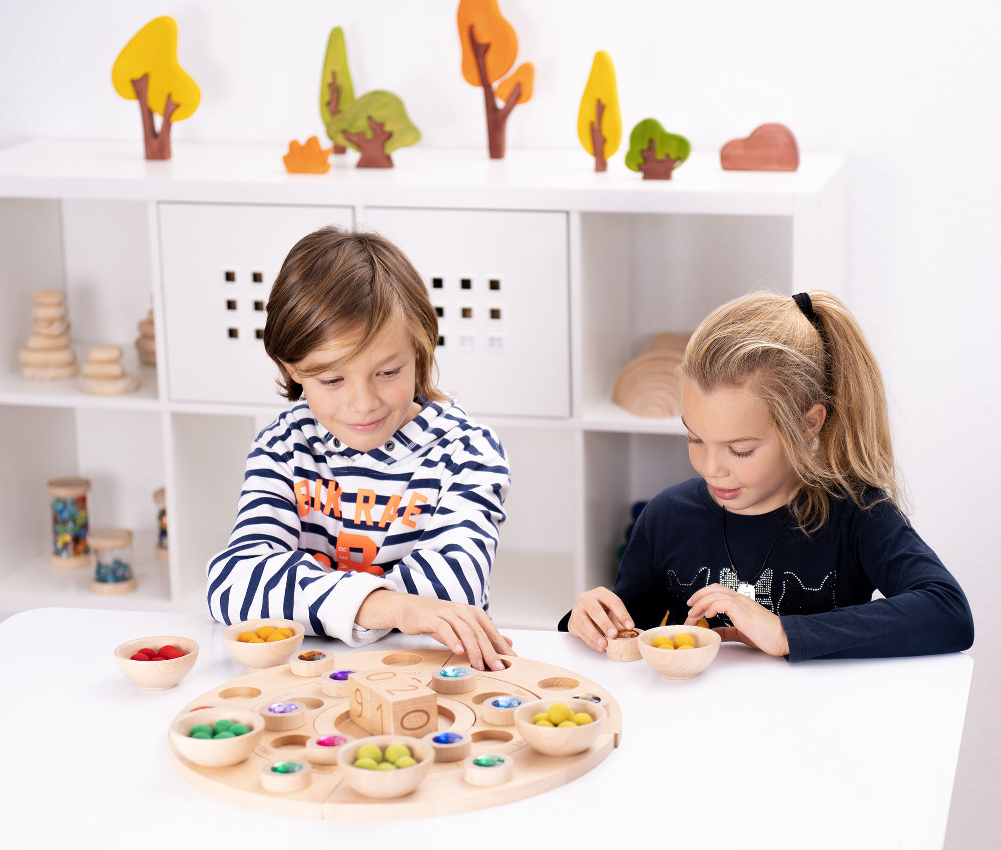 Teelichtern, Naturmaterialien, Glitzersteinen, Filzperlen und vielem mehr befüllt werden können. Die runden Aussparungen haben auch genau die richtige Größe, um Holzschalen für Sortierspiele (bitte separat bestellen, nicht im Set enthalten) aufzunehmen. Die mittleren Viertelkreise haben neben den Aussparungen eine