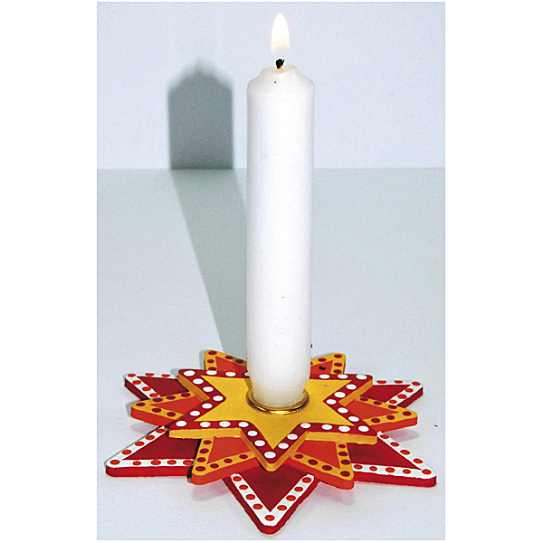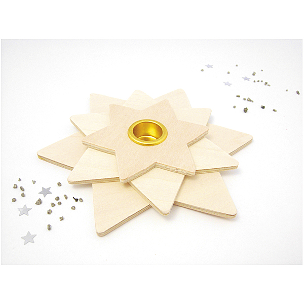 3 Sterne versetzt übereinander vereint, die sich individuell gestalten lassen. So entsteht recht schnell ein persönliches Weihnachtsgeschenk für die Lieben. Bodenplatte mit Metalleinsatz für Kerze. Empfehlung: Baumkerzen verwenden und nur unter Aufsicht Erwachsener brennen lassen.