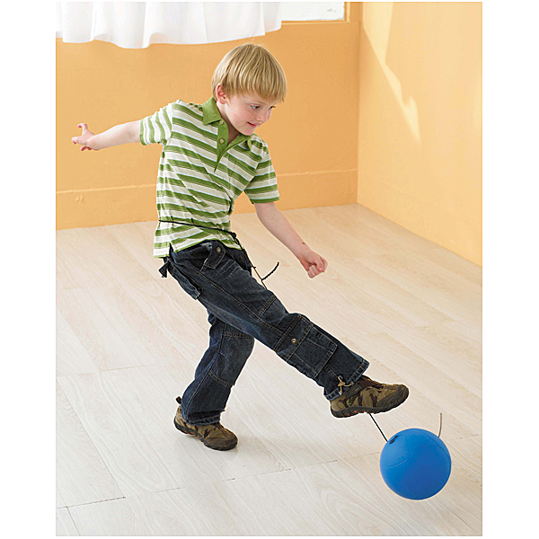 Der geht nicht verloren... Mit einer 150 cm langen Gummischnur die um die Hüfte befestigt werden kann ist der 20 cm große Ball immer in "Griffweite". Gespielt wird mit Hand oder Fuß.