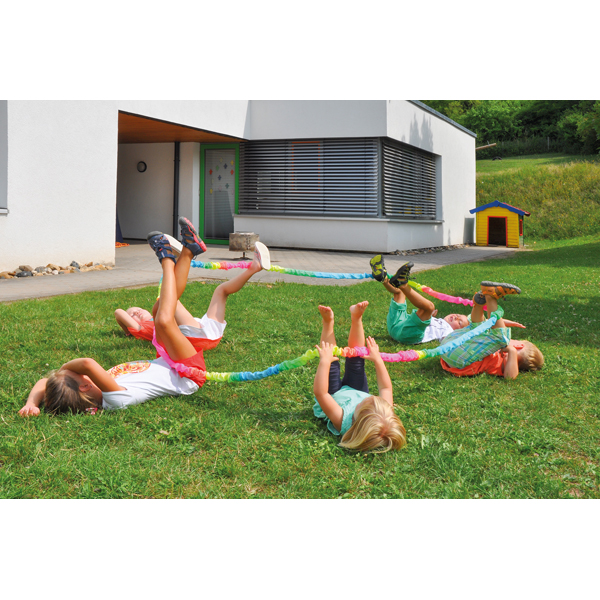 .Mit dem elastischen Kooperationsband können drinnen wie draußen tolle Gemeinschaftsspiele erlebt werden: aufeinander zugehen, sich gemeinsam im Kreis bewegen, Sternformen bilden, im Sitzen die Füße nach oben strecken und dabei das Band mit den Füßen halten ... Dabei lernen die Kinder das soziale Miteinander. Waschbar. Belastbar bis 100 kg.