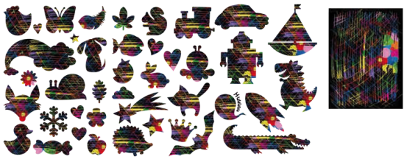 Vom schwarzen Papier zur kunterbunten Zeichnung? Das geht ganz einfach mit diesen Kratzpapier-Bögen. Spaß garantiert! Mit den Sticks können die Kinder zuerst das schwarze Blatt frei kratzen und so die bunten Farben zum Vorschein bringen, anschließend können sie die Schablonen nutzen, um damit tolle Figuren auszuschneiden.