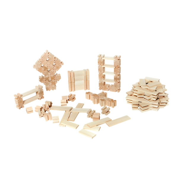 Aus drei verschiedenen Holz-Formen können Kinder die fantasievollsten Gebilde zusammenstecken, stapeln oder in die Höhe wachsen lassen. Das Bauen macht riesig Spaß und fördert Konzentration, Feinmotorik, Kreativität und Problemlösungsbewusstsein.