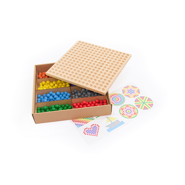 Das beidseitige Holzspielbrett hat eine runde und eine eckige Fläche mit Vertiefungen für die Holzkugeln und bietet damit vielerlei Möglichkeiten: Anhand der Vorlagen Motive nachlegen, Mandalas gestalten, eine dreidimensionale Pyramide in den Farben des Regenbogens bauen oder Muster nach eigener Fantasie gestalten. Auf der quadratischen Fläche können Kinder Tic-Tac-Toe spielen.