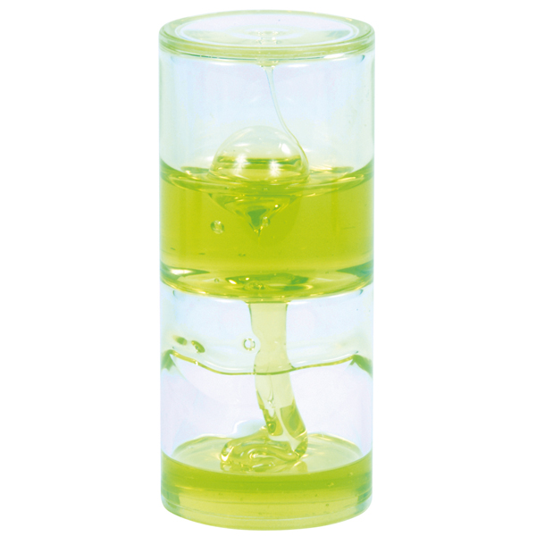 Umdrehen und staunen ... wie die geleeartige Flüssigkeit langsam durch das Loch in die zweite Hälfte des Zylinders gleitet und spiralförmig den Boden bedeckt. So kann Schwerkraft sichtbar begeistern. Innerhalb von ca. 5 bzw. 7 Minuten ist das faszinierende und beruhigende Schauspiel beendet. Hin und wieder steigt durch den Austausch eine Luftblase im oberen Hohlkörper auf.