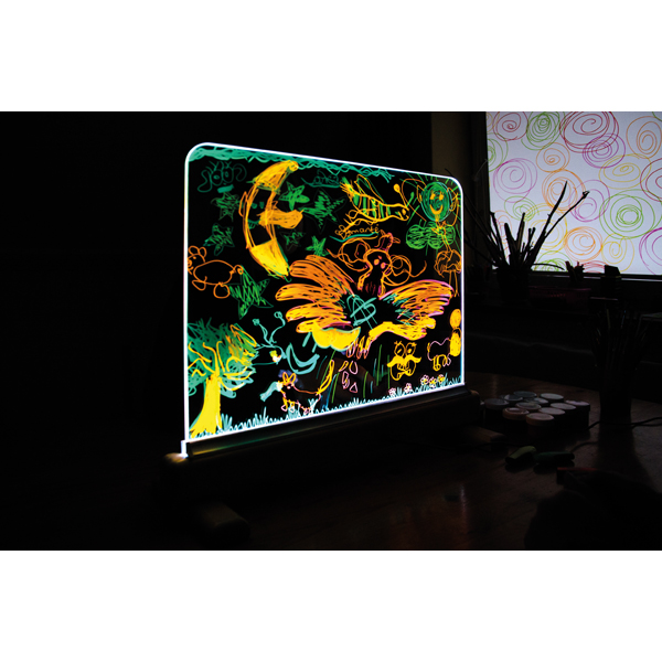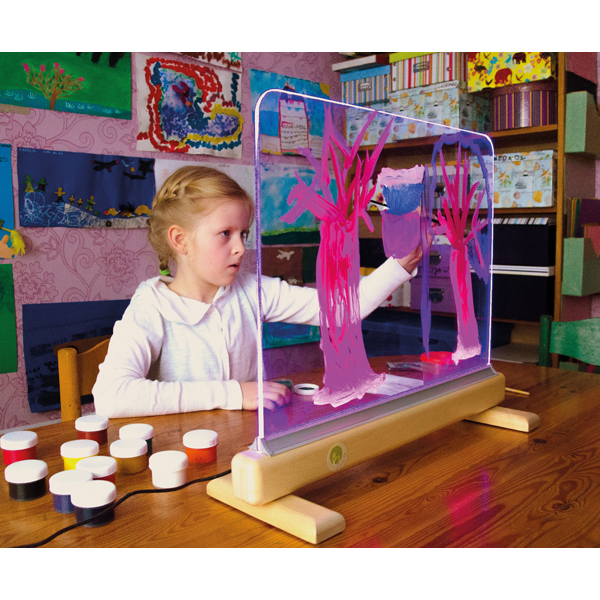 ...die hochwertige Leuchtstaffelei aus Spezialglas ist ein faszinierendes Medium zum Bemalen mit Fingerfarben, Gouache, Aquarellfarben und Leuchtstiften. Sie kann beidseitig von zwei Kindern bemalt werden und lädt so zum Experimentieren ein. Im Fuß aus lackiertem Massivholz ist eine LED Lichtleiste integriert, die das Kunstwerk erstrahlen lässt. Neben weißem Licht sind 15 weitere Farben und 4 Farbwechsel-Modi möglich - das Gemälde erscheint in jeder Lichtfarbe optisch anders. Zur leichten Reinigung mit Wasser kann die Glasscheibe aus dem Holzsockel herausgenommen werden. Die Ecken der Glasscheibe und der Holzelemente sind formschön abgerundet. Inkl. Fernbedienung, Gebrauchs-/Montageanleitung. Wird zerlegt geliefert (2 Standfüße müssen mit 4 beiligenden Inbusschrauben befestigt werden). Leistung: 14,4 Watt (Netzstecker mit Trafo). Gewicht: 4 kg.