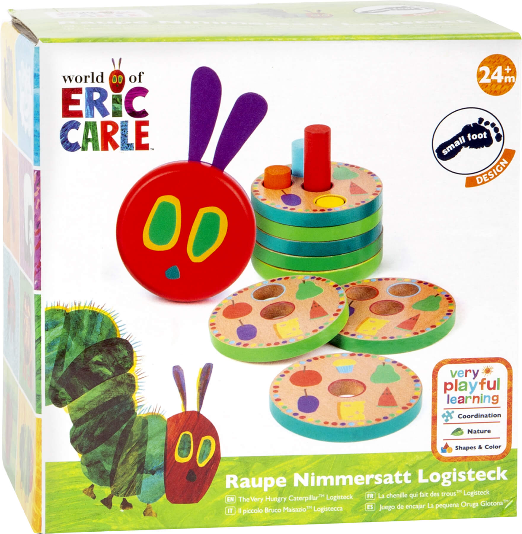 Durch welche Schichten hat sich die kleine Raupe schon gefuttert? Bei diesem Spiel ist vorrausschauendes Denken und Kombinieren gefordert. Richtig zusammengesteckt, entsteht der Körper der Raupe Nimmersatt, der nur darauf wartet, immer wieder auseinandergenommen und zusammengesteckt zu werden. Auf einer Grundplatte sind 7 unterschiedlich hohe farbige Stäbe angebracht. Die 1cm starken Scheiben haben eine unterschiedliche Anzahl an Öffnungen, sodass immer nur eine Scheibe die richtig Passende ist. Ein Spiel, welches nicht nur die Motorik und die Auge-Hand-Koordination fördert, sondern vor allem das logische Denken.