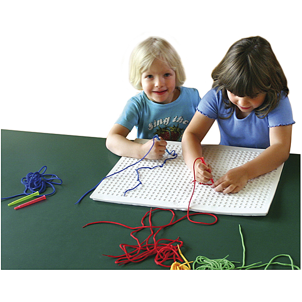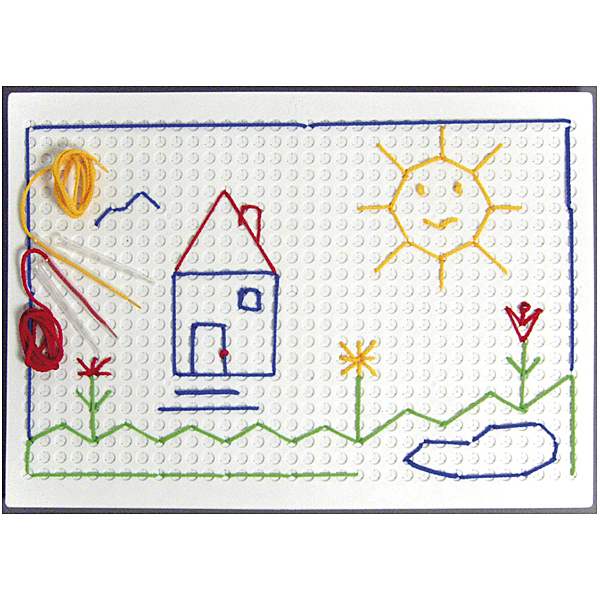 Auf dem ca. 50 x 35 cm großen Pickboard können Kinder ihrer Kreativität freien Lauf lassen. Mit dem Pickstift werden die 16 bunten Schnüre von Kreuzloch zu Kreuzloch eingepickt. Die Kreuzlöcher halten den Faden fest und das Motiv ist leicht wieder aufzulösen. Fördert die Konzentration und die Auge-Hand-Koordination.