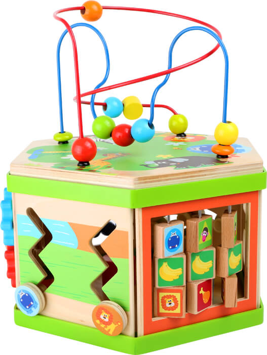 spielerisch die Motorik fördern Dieser Motorikwürfel bietet Spielspaß auf sieben Seiten! So gibt es ein Steckspiel, einen Rechenschieber, Schiebespiele, Drehscheiben und natürlich eine Motorikschleife. Elefant, Tiger und Zebra sind immer mit dabei. So dienen diese Spielseiten nicht nur der Grob- und Feinmotorik, sondern fördern auch spielerisch die Entwicklung von Mengenerfassung und der Auge- Hand- Koordination.