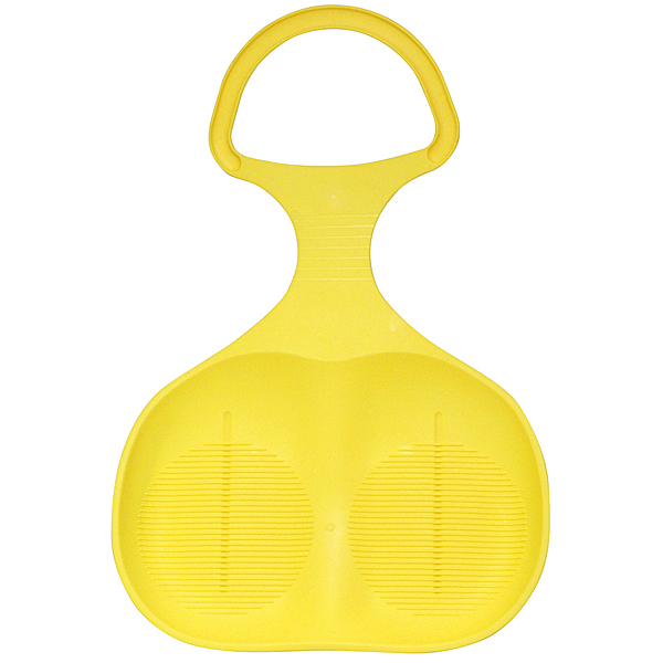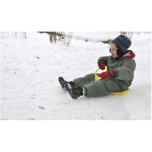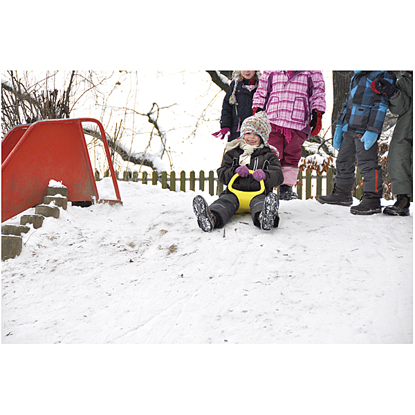 Schnell wie der Wind sausen die Kinder mit dem Poporutscher den schneebedeckten Hügel hinab.